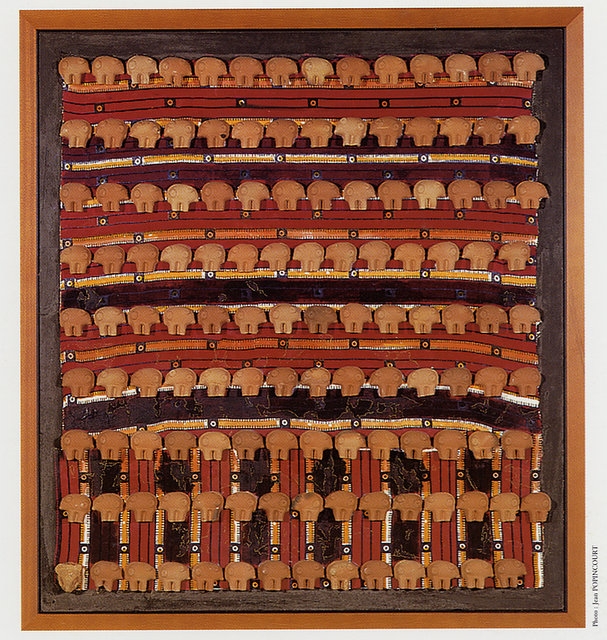 Ces entailles caractéristiques de la période saladoïde insulaire (7) réalisées sur la pâte séchée avant cuisson, au moyen d’un éclat coupant, sont retranscrites à la peinture acrylique sur les toiles. Victor Anicet expérimente de petites touches serrées dans l’esprit impressionniste, de larges touches plus libres, plus gestuelles dans des tonalités diverses, à dominantes ocre, vert, rouge et vert ou encore parme et jaune. Progressivement la poterie arawak cesse de n’être simplement qu’un sujet d’inspiration. Dans la série Restitution, la matière – terre entre dans la composition de l’œuvre, comme cadre dans un premier temps puis à l’intérieur même du tray. Victor Anicet y intègre en effet des adornos. Ce sont des moulages de décors des périodes saladoïdes et troumassoïdes (8), au nombre de neuf ; l’artiste y associe, pour équilibrer la composition, trois adornos qu’il a conçus. Il peut s’agir très exceptionnellement d’un adorno authentique qui conserve alors sa teinte d’origine. Ainsi dans les trays, les signes se superposent, les graphismes amérindiens venant cannibaliser, pour reprendre l’expression de l’artiste, les tissages africains créant de nouvelles lignes et contours métis.