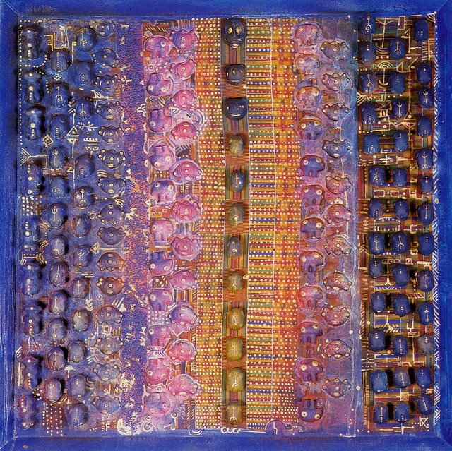 A son retour de Paris en 1967, Victor Anicet renoue avec une Martinique où la Négritude (1) connaît son apogée avec Césaire, Damas, Senghor. C’est aussi l’essor du mouvement des Black Panthers aux Etats-Unis. Cependant si le grand public concentre toute son attention sur l’héritage africain, il néglige ou oublie les premiers habitants de l’île, les Amérindiens. Pour Victor Anicet, s’intéresser à l’art amérindien et en restituer des éléments dans sa peinture et sa céramique est donc un cheminement volontaire, qu’il faut resituer dans le contexte de la recherche d’une esthétique caribéenne par le groupe Fwomagé (2). La rencontre avec une personnalité d’exception, le Père Pinchon, qui l’a initié aux fouilles archéologiques sur le site de Vivé (3) au Lorrain, alors qu’il était encore enfant, a été également déterminante. Deux séries distinctes naîtront de ce patient travail de découverte, d’appropriation et de restitution : Invocations amérindiennes, suite de tableaux sur bois ou sur toile réalisée entre 1975 et 1989, puis Restitution, à partir de 1989, où dialoguent outre les graphismes arawaks ou caraïbes, des adornos (4) amérindiens, des tissus africains, des produits échanges du troc triangulaire comme les fèves de cacao, le roucou, le café, les épices, la verroterie, réunis dans le tray traditionnel, détourné ici de son usage premier. A l’origine, objet du culte indou, le tray (5) a été utilisé comme objet usuel pour transporter la canne ou les pierres, ranger le linge repassé, isoler du sol un bébé endormi, jouer au serbi (6), avant de devenir une pièce de mobilier traditionnel, élégant plateau des salons créoles, équivalent du serviteur muet de Chippendale.