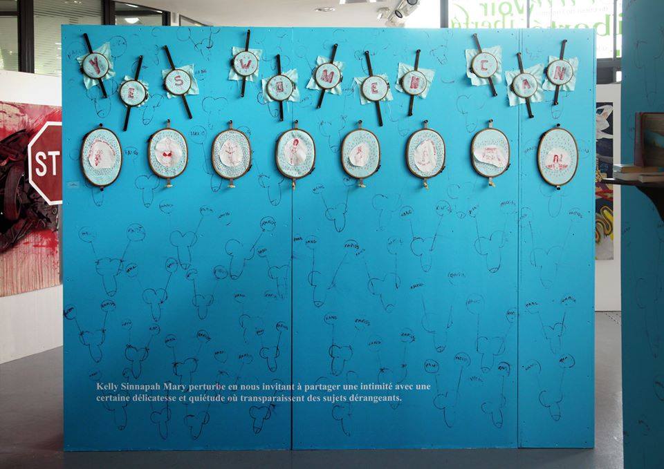 In her work, Kelly Sinnapah Mary uses mostly contrasts to denounce all types of violence and domination disguised in the deceptive softness of an intimate and feminine universe, with flowered pieces of material, tender colours, tiny embroideries.
