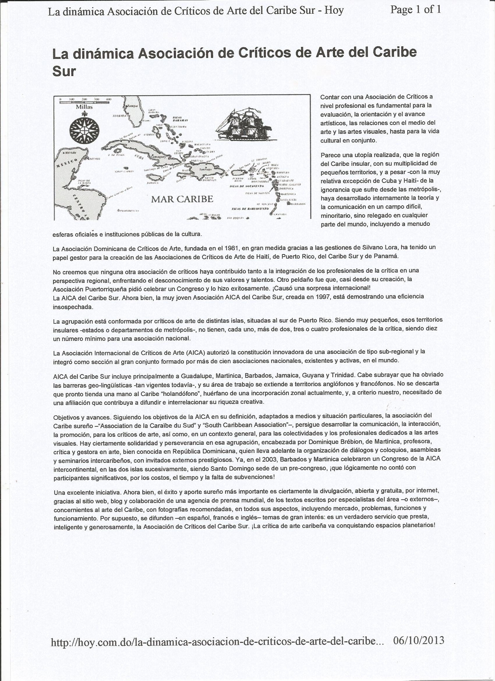 Siguiendo los objetivos de la AICA en su definición, adaptados a medios y situación particulares, la asociación del Caribe sureño – “Association de la Caraïbe du Sud” y “South Caribbean Association”- , persigue desarrollar la comunicación, la interacción, la promoción, para los críticos de arte, asi como, en un contexto general, para las colectividades y los profesionales dedicados a las artes visuales. Hay ciertamente solidaridad y perseverancia en esa agrupación, encabezado por Dominique Brébion -de Martinica-, profesora, crítica y gestora en arte, bien conocida en la República Dominicana