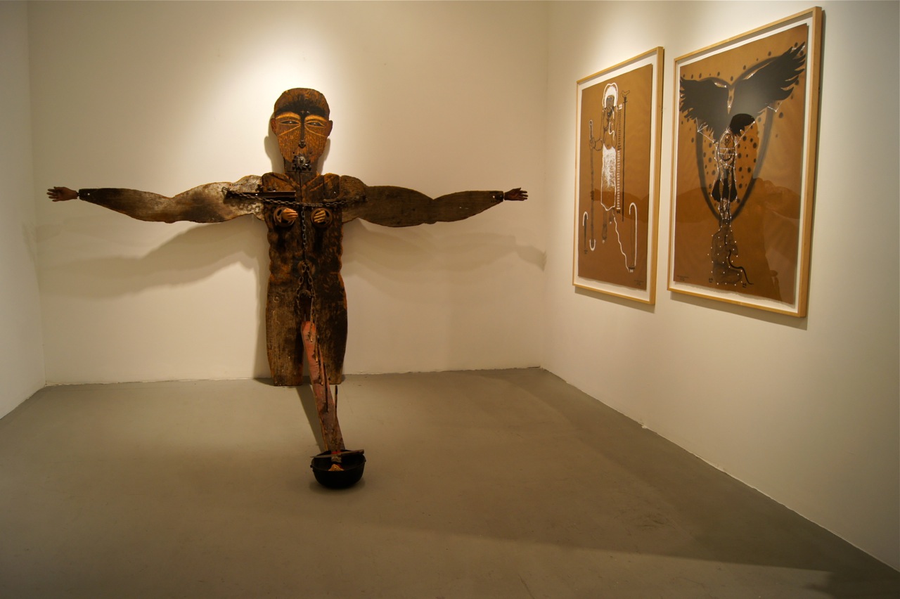 Les sculptures – assemblages d’un autre artiste de la Grand Rue, Eugène André dialoguent avec l’auto-portait de Nasson : « Je ne suis plus Nasson. Je suis Baron samedi. Je suis mes œuvres » et avec le saint homme du cubain Olazabal, crucifié ou bénissant comme avec certaines silhouettes de José Bedia. C’est qu’une inspiration commune est la source de ces œuvres : les rites et sociétés secrètes vaudou et yoruba. Ainsi les collages photographiques du cubain, Jorge Alberto Perez évoquent la légende Yoruba de Moremi.