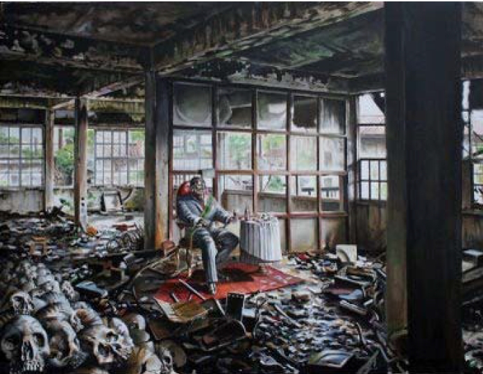Parmi elles, un commentaire incisif éloquent sur la situation politique du Zimbabwe par un jeune artiste jamaïcain, Michael « Flyn » Eliott. Il me semblait que Flyn dont le photoréalisme habituel faisait souvent des envieux avait prouvé avec cette peinture qu’il pouvait faire preuve d’une imagination débordante. Intitulée « Le Trillionaire », la peinture représente Mugabe replié sur lui-même et abstrait, assis au milieu des ruines et des débris d’un bâtiment brûlé.
