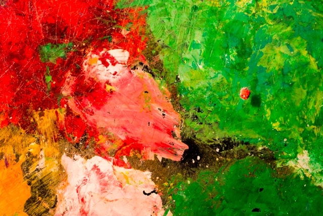 Upon entering the exhibition space you may be deceived, for a few minutes, into believing that you are viewing a collection of paintings. But these conflagrations of colour, these explosions of pigment are not paintings, but photographs. Blown up, vibrant and intense close-ups of various artists’ pallets, easels and canvases. The effect is dazzling. Your eyes do the work of your fingers, tracing over the contours of paint globs and colour mixtures.