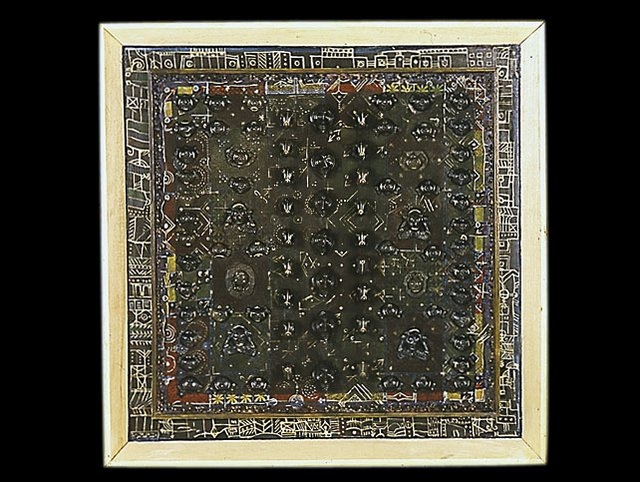 Victor Anicet, chef de fil du groupe « Fwomajé », est l’un des premiers artistes martiniquais à avoir revendiqué ses racines amérindiennes. Son travail est le résultat d’un cheminement personnel qui a débuté quand il était enfant en travaillant avec le Père Pinchon sur les sites archéologiques de « Vivé » au Lorrain. Cette initiation aux fouilles déterminera son goût pour la recherche, et il mettra ses connaissances au service de son art. C’est ainsi que l’artiste s’intéresse à l’art amérindien et en restitue des éléments dans sa peinture. De formation céramiste, il intègre les muraquitas qu’il fabrique dans ses compositions. Deux séries naîtront de ce travail d’appropriation et de restitution : Invocations amérindiennes, suite de tableaux sur bois ou sur toile réalisée entre 1975 et 1989 ; puis Restitution1 à partir de 1989 où dialoguent graphismes arawaks et caribéens, muraquitas, tissus africains et trays indiens. Pour l’artiste il ne s’agit pas de copier les signes amérindiens tels quels, mais de les détourner en les agrandissant, les épurant à l’aide d’outils et de médiums actuels.