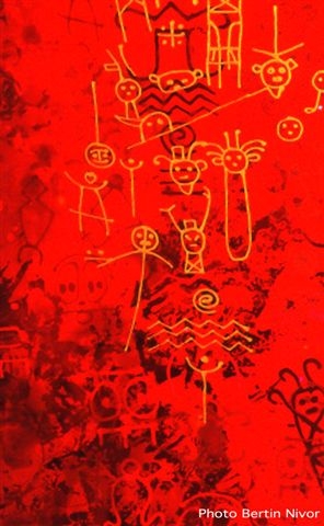 Bertin Nivor n’est pas dans cette dynamique d’interprétation et de détournement pour restituer. Plus dans prélèvement de signes directement sur la roche et le transfert direct, il intègre les graphismes tels qu’ils sont sans modification. C’est ainsi que l’on peut voir dans son œuvre Petroglyphur I daté de 2000, la reproduction de la femme grenouille de Ball Court Slad de Porto Rico, ainsi que dans Ruku-indigo de 2001, une réplique fidèle des pétroglyphes du site de Winefield de Saint Kitts.