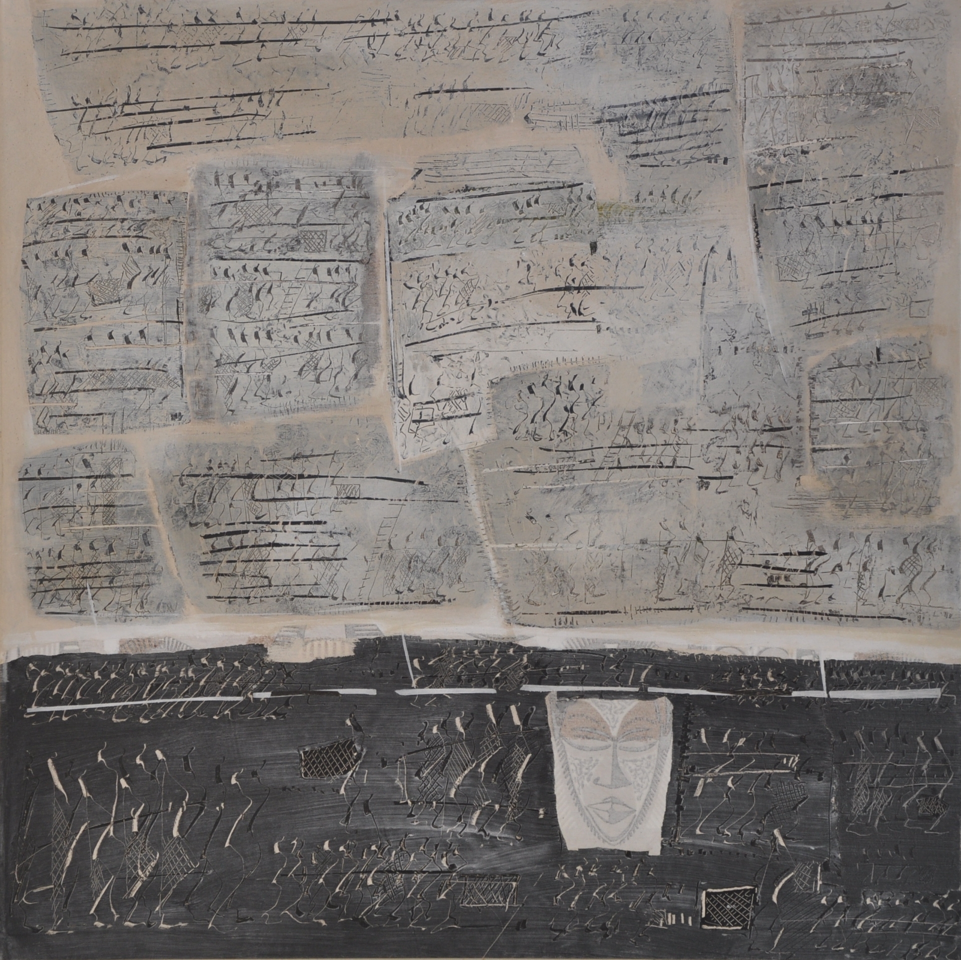 Les masques africains sont des références bien sûr d’ordre affectif compte tenu de mes origines culturelles. Ces référents contribuent à aiguiser ma sensibilité, à orienter mes choix intuitifs, à transposer différemment mes inscriptions et donc à travailler l’équilibre entre un motif imposé et ceux que j’invente. La fonction des motifs est d’articuler différemment une certaine présence à ces signes-silhouettes en leur permettant d’habiter un nouvel espace. L’espace extérieur : la toile, l’espace intérieur : dans le ressenti du regardeur.