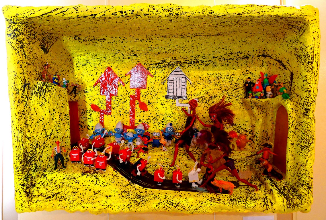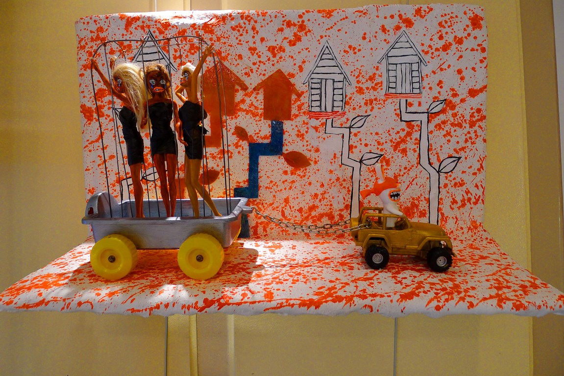 Clin d’œil à l’histoire de l’art, de Poussin à David, de nombreux artistes classiques ont peint l’enlèvement des Sabines, que l’on retrouve ici avec trois poupées Barbie remaquillées dans une relecture cocasse de l’histoire. Autre objet récurrent, la maison, référence directe à notre environnement d’où proviennent la plupart de ces objets mis au rebut.