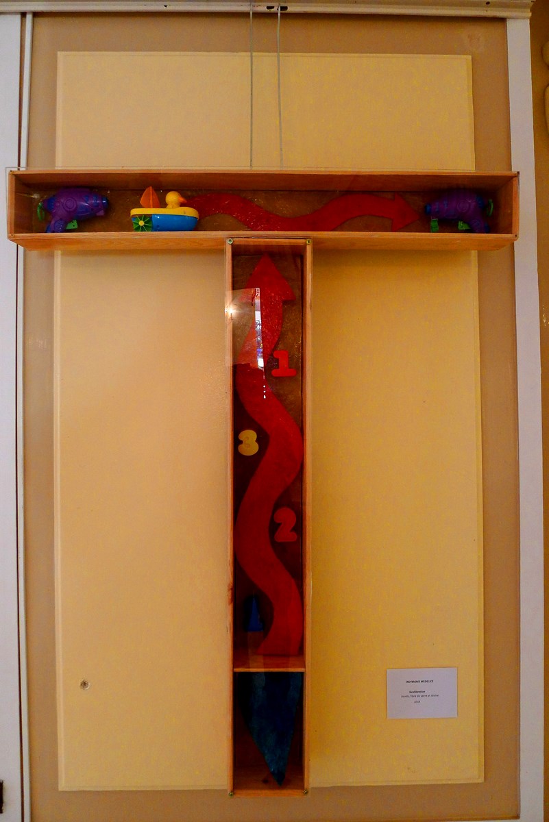 Pour Raymond Médélice, il s’agissait de présenter quelques tableaux, où il utilise l’acrylique sur toile, et des compositions qu’il intitule L’enlèvement de Sabines 1, L’enlèvement des Sabines 2, et Surélévation. Dans celles-ci, jouets, fibre de verre et résines entrent dans la composition, avec comme point commun avec les peintures des couleurs vives attirant le regard sur l’ensemble.