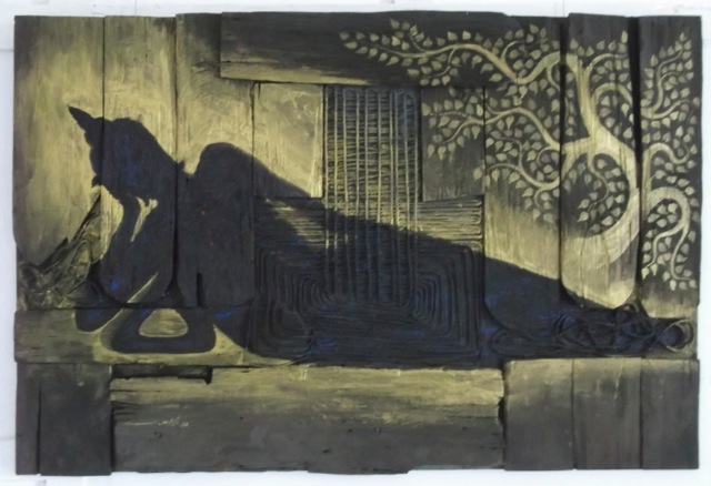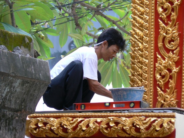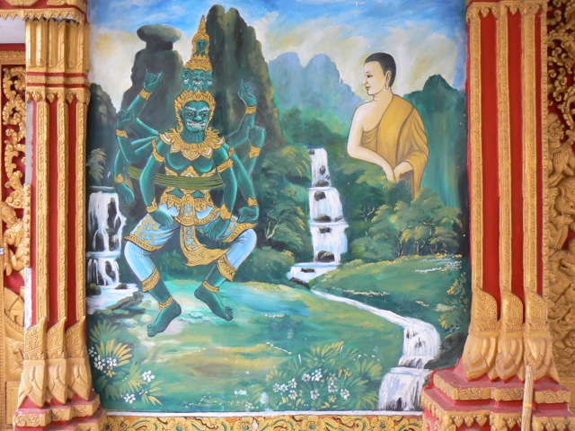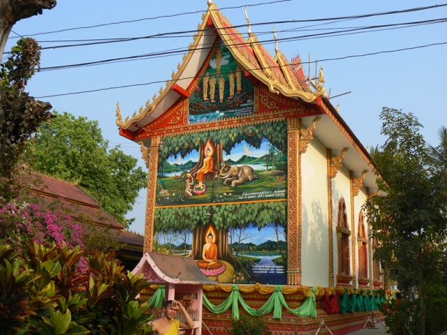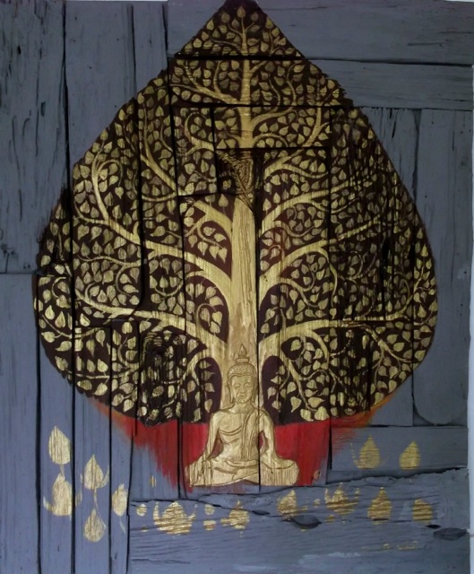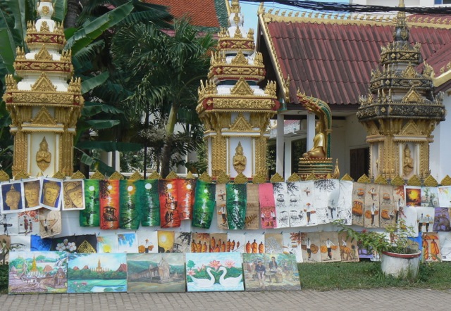Par ailleurs, et c’est toujours le même artiste qui expose en ce moment même, en juillet 2014, à la Maison de la culture de Ban Naxay une série d’images du Bouddha dans des positions canoniques. Ce sont des figures peintes sur des bois assemblés, des bois très durs, qui autrefois servaient de bardeaux pour les toits d’anciennes maisons traditionnelles