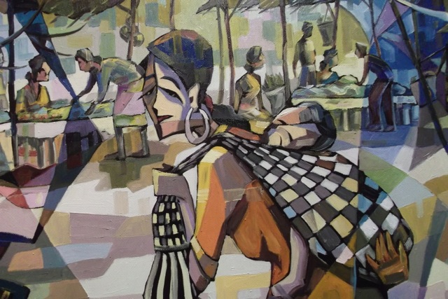 Parallèlement à cela, une autre série toute illustrative, très vive en couleurs et en puissance graphique est exposée dans une salle adjacente de la même galerie et retrace les scènes de marché de rues au Laos. Les éventaires, les marchandes, les enfants, dressent bien la scène de la vie paysanne avec ses accents fauves, et une recherche indéniable d’une évidente véracité narrative.