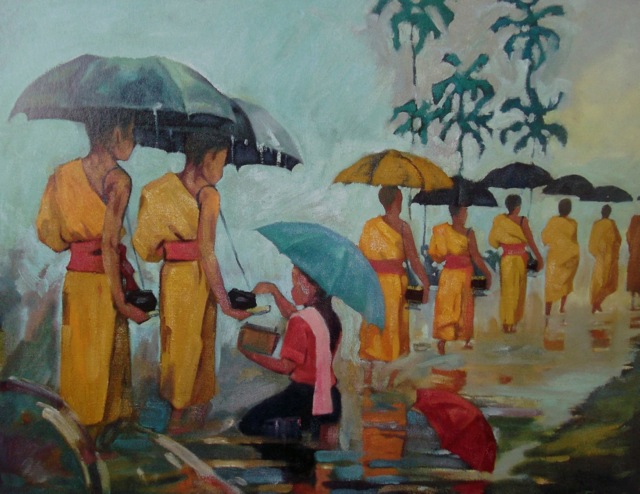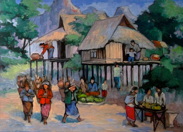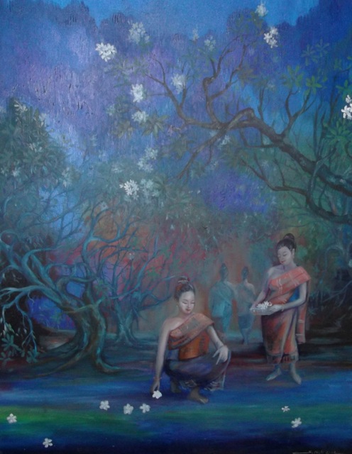Singulier, en effet, est le parcours de cet artiste qui a quelque peu voyagé hors de son pays et qui cherche de toute évidence à vivre de son art, un art qui prend place au milieu de sources multiples et parfois antagonistes, entre une réelle expression autochtone et un pastiche. En fait et en guise de conclusion, ce que nous observons au Laos est comparable à ce qui s’est passé en Afrique sub-saharienne lors de la colonisation : des peintres voyageurs européens se sont installés dans les divers pays (les exemples de la Côte d’Ivoire et du Sénégal sont probants) ont fondé des écoles et suscité des vocations, ouvert des écoles et ont ainsi donné naissance à des courant picturaux autochtones. Mais, pour toutes ces sociétés postcoloniales d’aujourd’hui, l’art est marginalisé par des mécanismes de reconnaissance des courants globaux. Il est possible qu’en Asie, les pôles émergents, à Singapour, à Shanghai, sauront faire basculer les tendances imposées par les dominants européens ou américains. La question reste cruciale : comment exister hors d’un imaginaire occidental et en même temps pénétrer un marché de l’art dont la maîtrise reste à ce jour inaccessible.