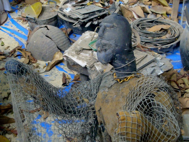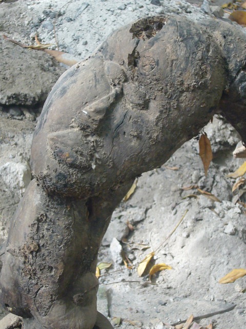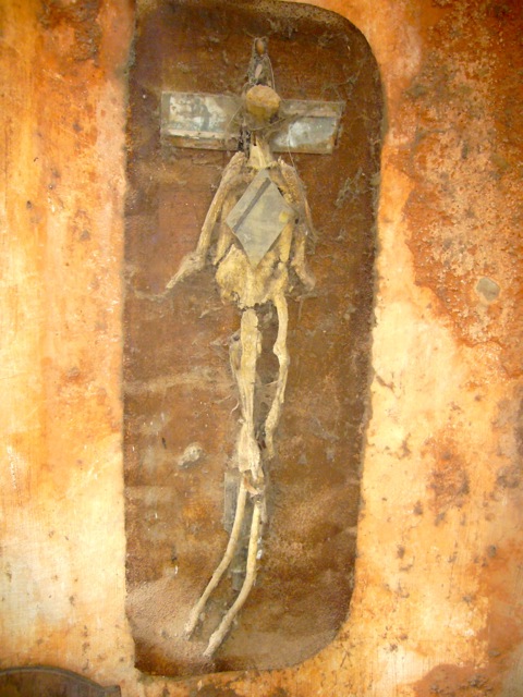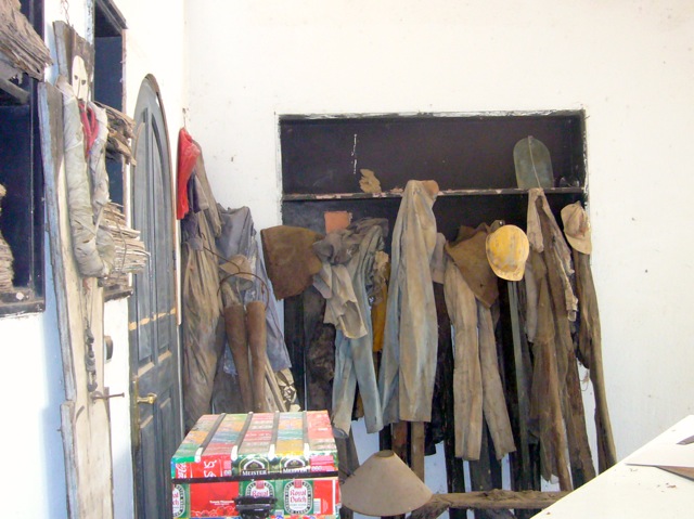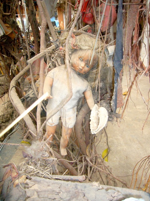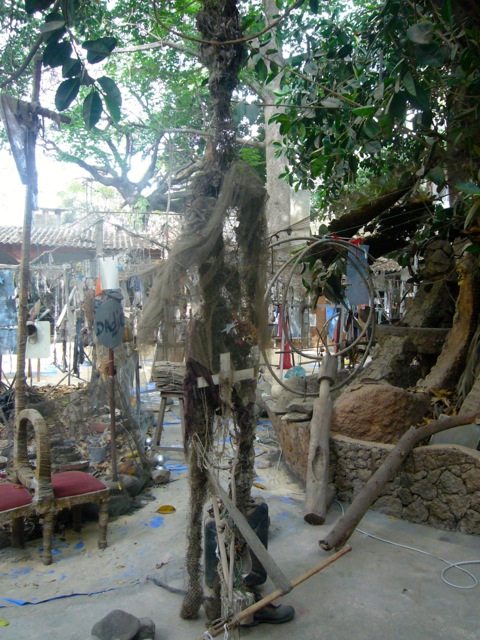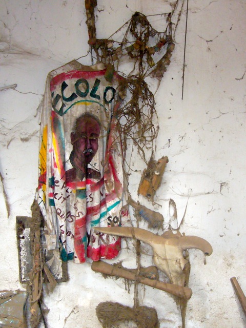Il faudrait d’abord comprendre qu’il ne s’agit pas d’une œuvre explicative ou documentaire, elle est installation à caractère sacré et demeure en même temps, niche de vie et acte de révolte. L’œuvre déploie une archéologie du métissage des cultures, des emprunts, des influences. Les objets trouvés et placés là ne sont pas « exposés » à la vue des amateurs d’art mais en situation de gestation permanente ou alors en décomposition ; le cycle de notre déambulation est ainsi désigné. C’est en ce sens que c’est un lieu du cycle vital ; les choses sont en connexion permanente, elles dialoguent les unes avec les autres, le haut et le bas, le sous terre avec le ciel, le végétal avec le minéral, le créé avec le trouvé sur place, le déchiré avec le recousu, le cri avec l’amour, la poussière avec la feuille à peine éclose.