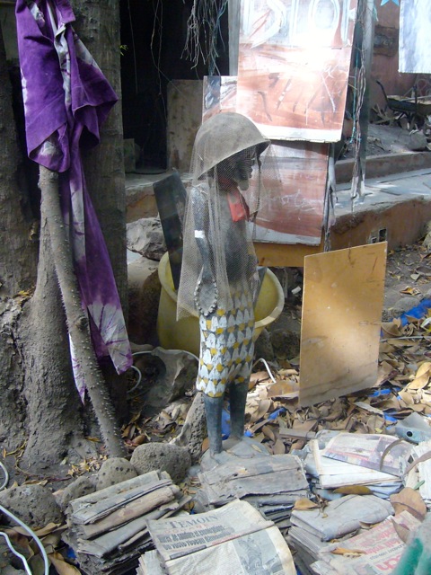 Beaucoup de fils, de nœuds, de ficelles et de liens. Ils sont à proximité des arbres et ressemblent étrangement aux autels aux ancêtres où flottent des lambeaux de tissus que l’on voit chez les Marrons du Nouveau Monde (et qu’on appelle Faka Tiki). Ces tissus pendent, s’effilochent, il faut les vénérer cependant, c’est une manière de garder le lien avec le monde des origines. Pour Jo ces tissus qui pendent des branches du banian sont peut-être en relation avec les Faka Tiki de l’autre bord, plus loin. Qui sait ? Il y a tout un espace consacré aux « bois » statues, effigies, masques, sculptures de la famille des « fétiches », ils se trouvent plutôt à gauche de l’entrée et semblent sommeiller parmi les calebasses vides. Un clin d’œil sans doute aux marchands, aux commerçants qui sont assez nombreux et célèbres dans le quartier, rue Félix Faure et Jules Ferry. Ici sont entreposés les « invendables », définitivement hors circuit, mais cependant actifs et présents. Des statuettes de type « colon » sont aussi exposées et portent le casque colonial, une autre sculpture dresse les mains au ciel et retient un filet qui l’entrave. Une autre comparaison peut être évoquée, celle des jardins des Africains américains du sud des Etats Unis, ces yards où s’entassent collections hétéroclites et autres possessions, sculptures, inventions de mondes parallèles, de manipulations obsédantes qui rendent plus douce la vie tout court. Ces jardins d’art brut apportent un accent de singularité et de présence à proximité des mornes villes de l’Alabama.