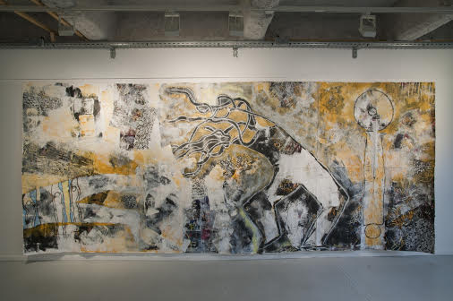 Belle exposition. Une scénographie classique, très clean, bien adaptée à l’espace, naturellement très lumineux de jour. Dans la plus petite des deux salles, Habdaphaï avait disposé des tableaux qui témoignent des débuts de la série, mettant en scène l’historique du signe entre 2011 et 2012. Dans la salle principale étaient exposés les travaux de 2013 et 2014. Au total plus d’une trentaine de pièces donnaient à voir la progression dans le traitement du thème.