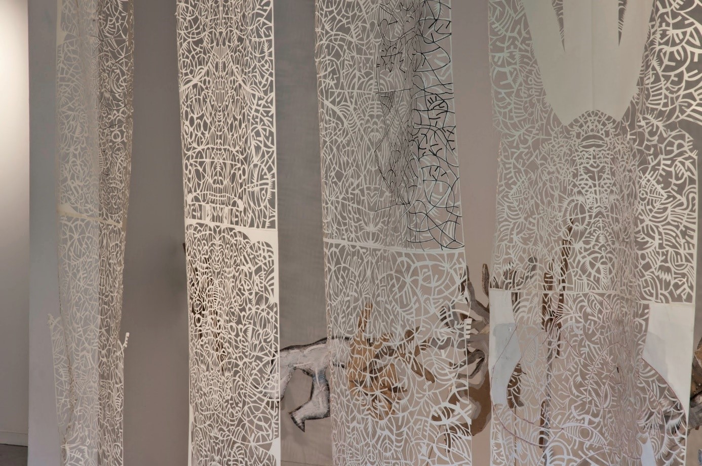 A l’ISBA Habdaphaï a présenté des sculptures de porteurs de mots en carton et en bois comme dans un petit théâtre d’objets, que l’on découvre derrière un rideau en papier dentelé, dans un espace dessiné par des ombres et des figurines un peu dansantes. J’aime la délicatesse et la fragilité de cette pièce. Les petites sculptures sont comme qui émoussées par l’étoffe ouvragée du rideau. Ce travail d’une finesse infinie a quelque chose de féminin et d’intime. Il évoque pour moi le temps et la patiente des travaux textiles. Tout ce blanc fait penser aussi à un autel de candomblé. Les sculptures disposées derrière le voile, à l‘abri des regards, le spectateur devient un peu voyeur. Comme lorsqu’on regarde par la fenêtre l’intérieur d’une maison de poupées. L’installation fluide est si finement achevée qu’on pourrait presque entendre le murmure des récits racontés par les porteurs. Une atmosphère particulière et épurée. Un nouveau tournant dans la production de l’artiste.