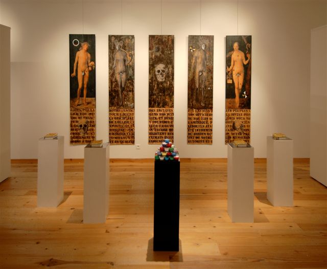 Installation de cinq panneaux de bois pyrogravés, huile, décalcomanies, clous, bougies – 2008 – Photo Dino Feigespan
