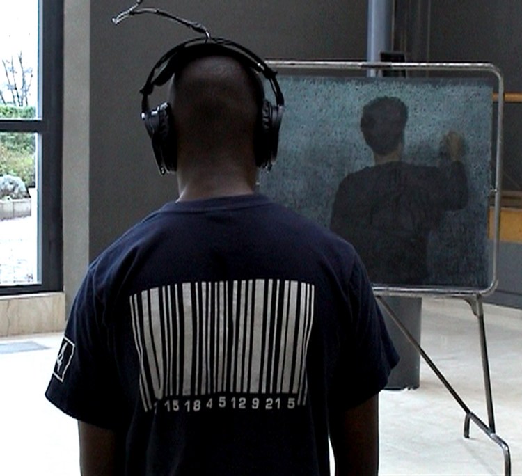 Installation vidéo et sonore DVD, tableau d’école noir, craie blanche, casque audio, enceintes-2004- dimensions variables