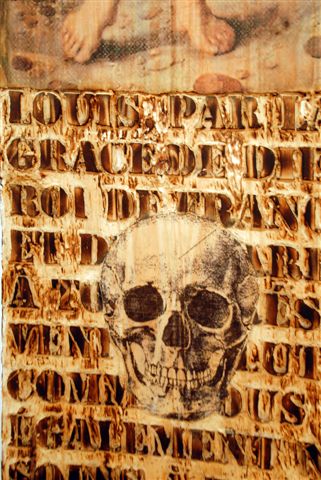 Installation de cinq panneaux de bois pyrogravés, huile, décalcomanies, clous, bougies – 2008 – Photo Dino Feigespan