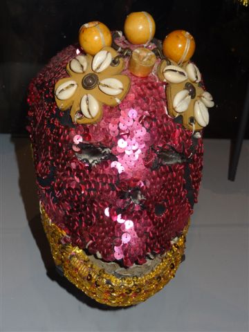 C’est bien à ce répertoire là que semblent s’identifier les crânes pailletés de Dubréus Lhérisson, exposés en ce moment à Paris. Présentés au Grand Palais à l’occasion de l’exposition « Haïti », ils sont en position de trophées, certains dressés sur une hampe ou à plat sur une surface (Fig.1 à 4). Plus que recouverts de paillettes, les crânes sont parfois décorés de coquillages, de perles, de sequins, enjolivés de cauris et de boules d’ambre et enluminés à la manière baroque sud-américaine, comme le souligne dans son article Scarlett Jésus, à propos des œuvres de Jean-Marc Hunt (2).