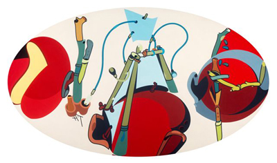 Le fond joue la page blanche ou s’articule en rectangle de couleurs saturées. La toile elle-même peut être articulée en plusieurs châssis car Télémaque questionne la tradition du cadre, allant jusqu’au tondo, au trapèze, au triangle.