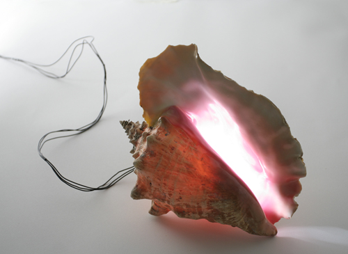 Conch on de 2009 de Blue Curry comme Mélangean de 2014 de Ian Deleón   veulent attirer tous deux le regard vers l’intérieur secret de la conque. L’un en insérant une source lumineuse, l’autre en peignant l’extérieur en noir.