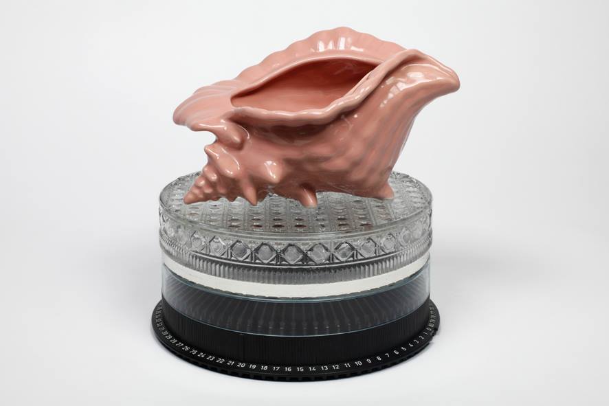 Le recyclage et l’association d’un élément naturel à un élément manufacturé est une constante du plasticien. Le public a en mémoire la mâchoire de squale d’où coule une cascade de bandes magnétiques obsolètes de l’exposition Global Caribbean présentée en 2012 à la Fondation Clément comme une critique du déferlement d’une culture mondiale dévorante sur la Caraïbe . Deux assemblages de 2011 , Untitled ( flower vase, cake stand, decorative plastic shell- 35 x 20 x 20 cm) et Untitled ( slide projector carousel, ashtray, decorative planter- 25 x 25 x 25 cm) se fondent sur ce même principe d’assemblage d’ éléments discordants. Un coquillage en plastique, un vase à fleur, un plateau à pâtisserie d’une part et d’autre part, un coquillage en céramique, un cendrier, un carrousel de projecteur à diapositives. Cependant cette improbable rencontre ne semble pas déclencher la poésie du bizarre telle que la concevaient les surréalistes d’après la célèbre phrase du Comte de Lautréamont  Beau comme la rencontre fortuite sur une table de dissection d’un parapluie et d’une machine à coudre  (Chant VI).