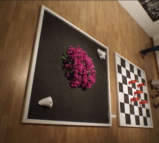 Bruno Creuzet a présenté en 2015 en Martinique un diptyque, Un jour une nuit, composé de deux panneaux horizontaux de mêmes dimensions posés sur le sol. L’un tapissé de sable noir où reposent deux conques polies par les vagues jusqu’à l’usure, une couronne de bougainvilliers mauves destinés à se flétrir pendant l’exposition. L’autre a une structure d’échiquier de sable noir et de carreaux blancs traditionnellement utilisés pour recouvrir les tombes martiniquaises. Des bougies – lumignons remplacent les pions. La thématique du cimetière, de la mort, de la fugacité de la vie est évidente