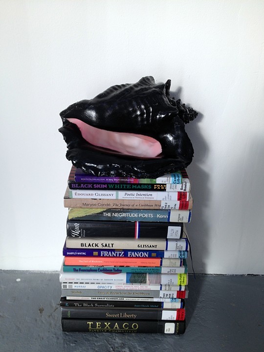 La conque peinte en noir de Ian Deleón , entrée depuis peu dans une collection privée martiniquaise, surplombe une pile de livres prêtés par la Bibliothèque publique de Boston. Ce sont des ouvrages sur la Négritude et la Créolité de Frantz Fanon, Edouard Glissant, Patrick Chamoiseau, sur le surréalisme, sur les postcolonial studies.