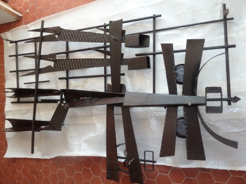 La sculpture est fixée par onze tiges en fer et boulonnée devant un fond peint au moyen de pigments glycéro et acrylique. C’est un assemblage de divers de métaux parfois récupérés et recyclés : tôle striée, fer à béton, tube carré, deux cache- culbuteurs de voiture ancienne, fers carrés de dix assemblés par soudure.