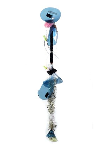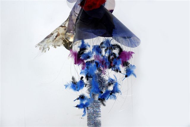 Une nette évolution marque le passage de Reconstitution d’une tribu perdue aux installations de la Série Féminin. Si le principe d’une accumulation de formes verticales suspendues par la partie supérieure demeure, le film radiographique découpé, sculpté, agrafé et agrémenté de fragments de photographies est remplacé par des transparents conçus et imprimés numériquement par l’artiste associés à une multiplicité de colifichets très colorés.