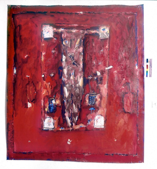 Comment intituler cette toile de 1993 ? Certes un titre donné par l’artiste appauvrirait limiterait l’imaginaire du spectateur trop docile, mais ce respect scrupuleux de l’autre ne facilite pas la critique ou le simple désir de communiquer sur une œuvre. L’arbitraire et l’insuffisance de « Christ jaune » invite à un autre baptême…Opus1993-15B ? Musical, mais sans références plus précises, très inexact…