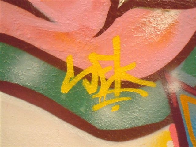 Sur le mur situé à gauche de l’entrée, chacun des deux artistes a inscrit son nom, en grosses lettres rondes bubble, à l’aide d’une mousse expansive. Entre leurs deux noms STEEK a fait figurer d’autres rondeurs qui reproduisent un motif stéréotypé de tatouage, et que souligne l’inscription « Fessboobs », placée au dessus. Celui d’une femme en string, assise de trois quart dos. Mais, de façon humoristique, celle-ci ne montre pas son visage, celui-ci se trouvant caché par le portable avec lequel elle réalise un selfie. Doit-on n’y voir que de l’humour ? Ou bien celui-ci s’accompagne-t-il d’une mise en garde critique de l’artiste à l’égard du franchissement de la sphère privée ?