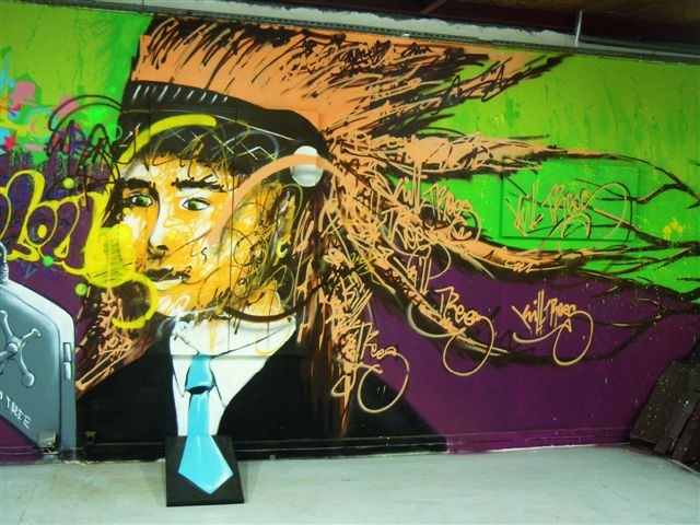 STEEK et TATANE s’affrontent ensuite dans la réalisation de portraits, comme pour un battle. Ainsi, aux portraits de Bob Marley et de Notorius Big réalisés par TATANE, STEEK répond par ceux de Damien Marley et d’Amy Whinehouse. Et, à l’étrangeté du maître Yoda, que TATANE dote d’une vue d’extraterrestre, STEEK oppose une femme tigre dont les yeux lancent des flammes. Entre ces deux personnages, STEEK a représenté un jeune chef indien. Malgré l’uniforme dont il se trouve affublé, l’exubérance des plumes qui s’échappent de sa casquette et le tracé d’une cravate qui, hors mur, se prolonge au sol, indiquent que celui-ci demeure bel et bien un rebelle. S’agirait-il d’un autoportrait qu’il conviendrait de décrypter ?