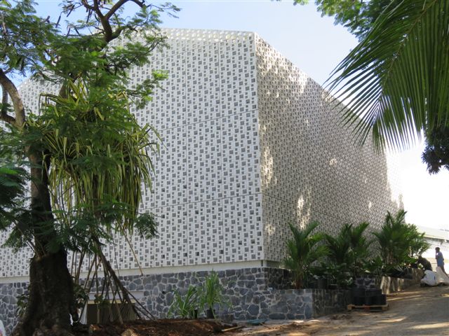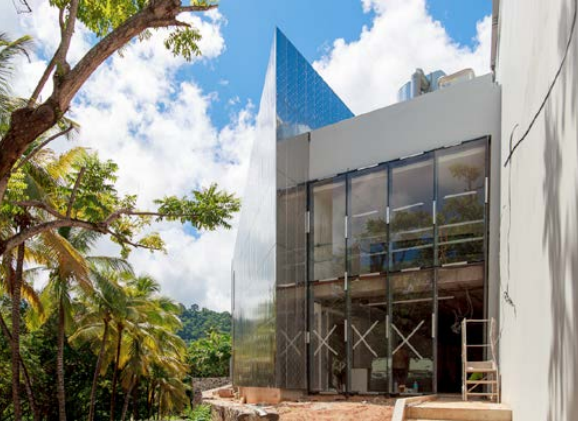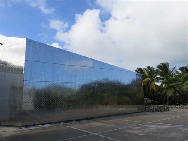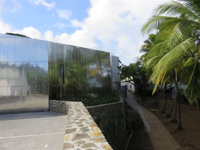 En acier inoxydable perforé et gaufré, la façade comme un miroir complexe absorbe la couleur des bâtiments historiques et de la végétation et reflète la lumière et les ciels changeants de la Martinique.