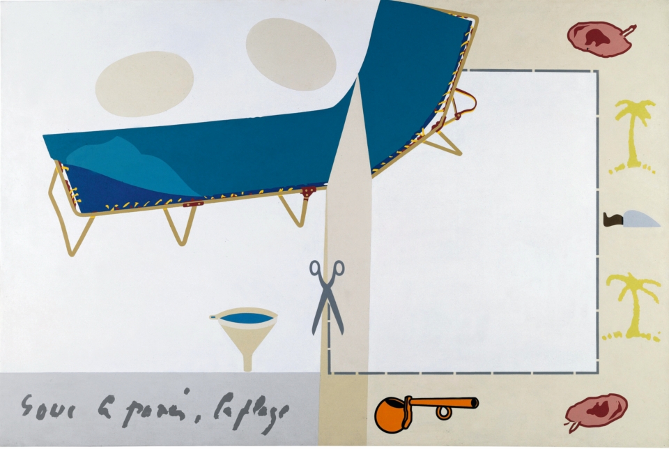 Cependant il a détourné cette image proche d’une publicité d’agence de voyage par l’adjonction d’éléments insolites dans le contexte comme la canne et le sifflet.