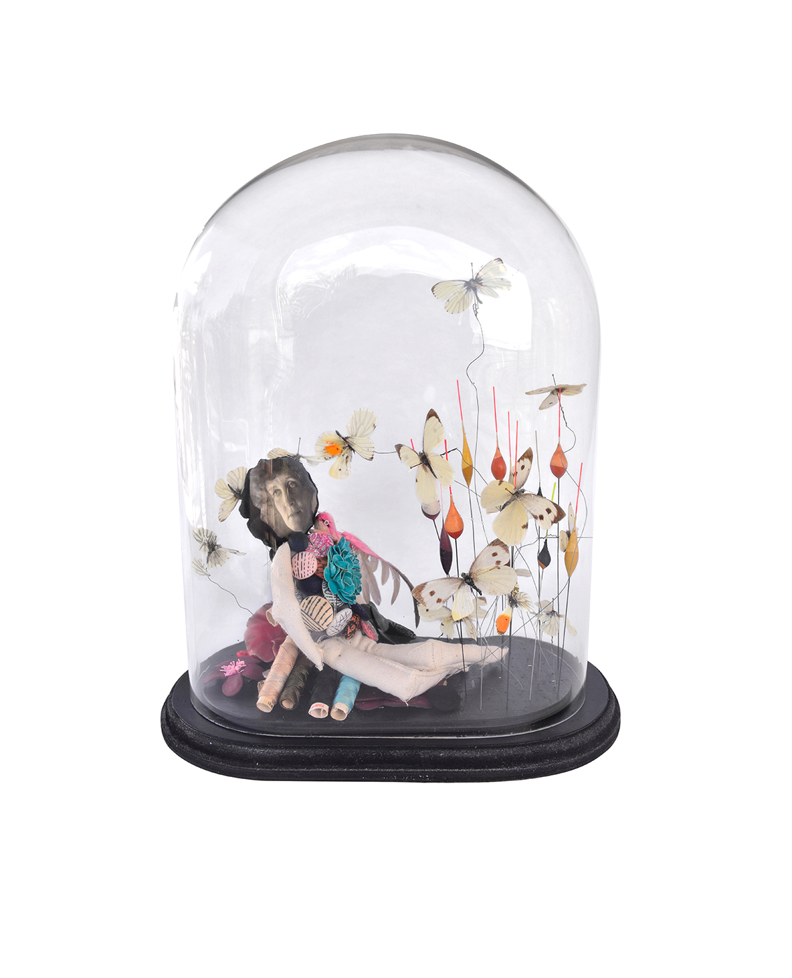 L’artiste mettra en dialogue d’autres créations présentées sous cloches de verre, tantôt ouvertes tantôt fermées, ce sont ses reliquaires d’amour. Voici celle où une femme au visage très doux est gardée dans un univers protégé, diaphane et enchanteur. Notre fée surgit d’un jardin imaginé où les fleurs n’ont pas éclos et dont la forme évoque la chrysalide, vient y flotter quelques papillons légers aux couleurs délicates pour célébrer le baiser d’un oiseau. J’y pressens une résurgence où me revient ces vers d’Apollinaire : « Et je chantais cette romance, sans savoir que mon amour à la semblance du beau Phénix, s’il meurt un soir, le matin voit sa renaissance. »