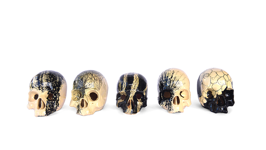 En contrebas, sur le côté, une étagère accueille quelques vanités peintes ou griffonnées de noir, elles sont au nombre symbolique de sept, nous voilà reparti pour un tour.