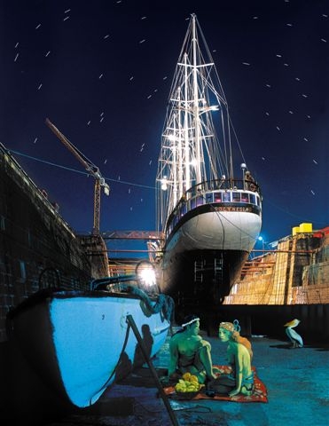 Marcel Duchamp brought a playful and parodic side to appropriation when he wrote L.H.O.O.Q. (1919) beneath the Mona Lisa. This iconoclastic touch can be seen in Alpizar’s La Revancha series and the digital fairytales by Jean-Baptiste Barret. The sense of strangeness in Barret’s work undoubtedly springs from the juxtaposition of abandoned, disillusioned and usually night-time urban landscapes with characters taken from art history inspired by anyone from Raphael to Gauguin. These contradictory worlds are steeped in subtle humour. Jean-Baptiste Barret and Ruben Alpizar share this light-hearted irony and a unique remix approach separating and removing isolated silhouettes rather than appropriating an entire piece.