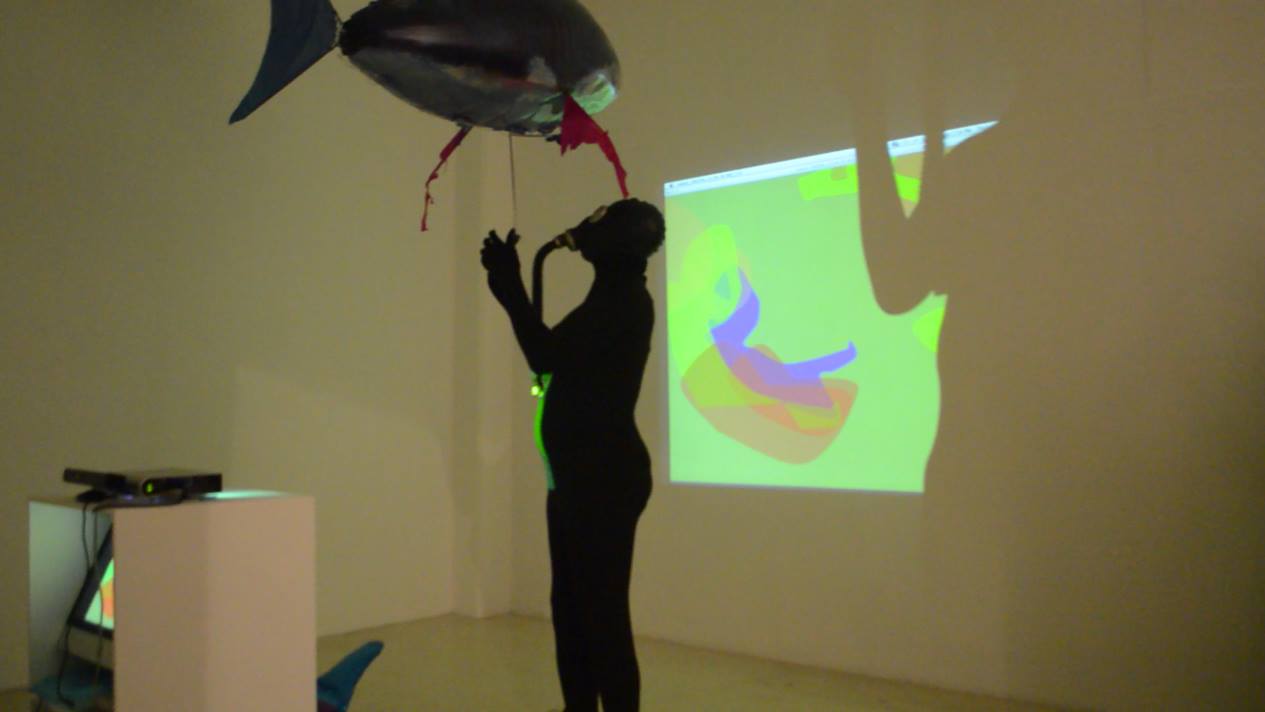 Trois poissons dirigeables – ballons gonflés à l’Hélium, sont dirigés à distance par les mouvements de deux performeurs. Les requins – ballons sont contrôlés par une Kinect. Le capteur biométrique de la Xbox récupère des informations sur les positions des performeurs, les transmet à un ordinateur où un programme traite ces données, les transforme en déplacements exécutés par les ballons