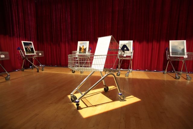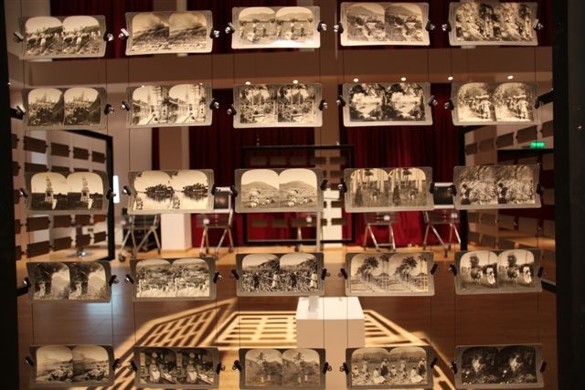 La scénographie est particulièrement novatrice, avec les stéreoviews suspendues sur un portique de fils de fer en ilot central et les photos contemporaines installées sur des caddies de supermarché tout autour.