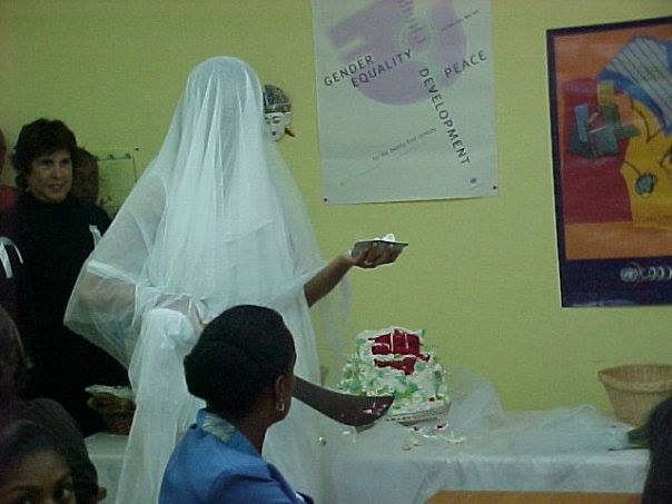 De même, la plasticienne originaire de Trinidad, Adèle Todd, performeuse, photographe, artiste brodeuse, stigmatise les violences conjugales avec son gateau blanc en forme de berceau et son voile de mariée.
