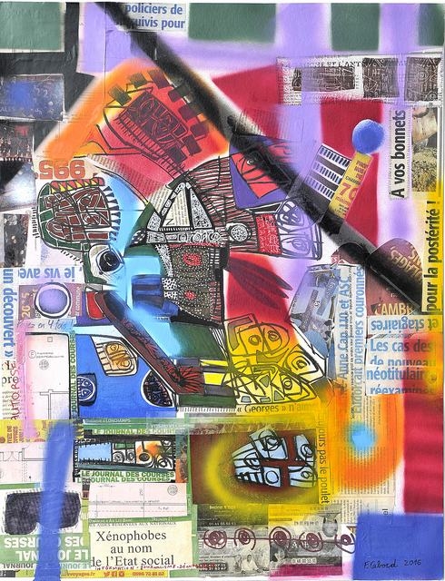 L’utilisation des coupures de presse, c’est le rappel d’un matériau que j’affectionne particulièrement. Le collage c’est aussi un prétexte à découper, coller, superposer, se jouer des mots, des textes et même des images que l’on recouvre pudiquement.