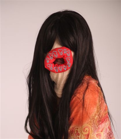 C’est un masque mexicain de Lucha Libre (catcheurs mexicains, héros populaires de la culture populaire mexicaine) que j’ai recouvert de motifs dorés. Le masque et ou la cagoule ont une grande importance dans mon travail. On retrouve le personnage “Vagina” anciennement cagoulée dans un autre contexte avec cette fois ci un masque, cette femme n’est plus prédatrice mais protectrice envers sa progéniture. Avec ce masque laissant apparaître la bouche, je montre la mère et ses intermittences : la femme cachée dans la mère, et la mère cachée dans la femme. Le masque questionne l’identité de la femme. Avec l’évènement de la maternité, la mère est souvent tentée de renoncer à son identité de femme et d’adopter à plein temps son rôle de mère en s’investissant totalement pour s’occuper de ses enfants. Des auteures féministes l’affirment, il ne faut pas choisir d’être femme ou être mère, puisque choisir, c’est renoncer à l’une des options. Le père détient lui aussi un rôle crucial durant cette période, j’aimerais traduire cela dans une prochaine série.