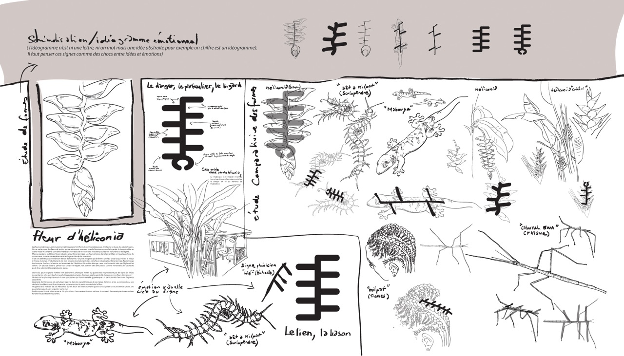 L’inventivité et l’originalité de la mise en espace tiennent au mode d’intégration de l’œuvre dans le lieu d’exposition et au choix de la signalétique de l’exposition. Certes, il y a des œuvres au sol, au mur, sur socle, soit une simple armature métallique soit une accumulation de vieux meubles récupérés mais toujours l’installation est pensée  pour fusionner avec l’espace d’exposition : derrière les deux bustes, celui du nègre au carcan en céramique émaillée et celui du lapin en terre cuite, un pan de mur de la galerie peint de la même couleur que le buste placé devant, fait partie intégrante de l’œuvre.  Et au sol, au pied de l’installation, la légende prend la forme d’un logo inventé par l’artiste qui dialogue avec les logos des marques de luxe, Vuitton et Chanel. Il n’y aucun cartel signalant le médium, le titre, l’année ; le spectateur n’a que le seul logo conçu  par le plasticien comme indication : « C’est un alphabet émotionnel tiré de mon environnement visuel précise Eddy Firmin. Les signes (il y en a 18) de mon alphabet émotionnel sont mon «ça-voir» culturel, unique et singulier. C’est la volonté d’accorder ma culture d’oralité (où raison et émotion participent à l’élaboration du savoir) avec son nouveau support de  l’écrit commandé essentiellement par la raison (celle d’une scolarité dominé par le rationnel et l’affaissement de l’intelligence sensible). Les phrases émotionnelles qui en résultent, expriment mon utopie de voir naître une «oraliture» nouvelle où  le sensible et l’intelligible se complèteraient pour produire une manière d’aborder le savoir en accord avec celui que la Caraïbe a mis au monde. Un savoir toujours conscient que le déséquilibre en faveur de la raison seule mène au déséquilibre tout court. »
