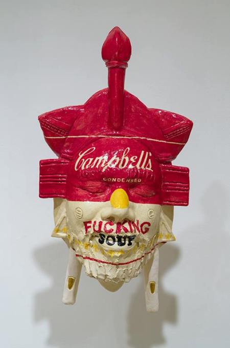 La pratique artistique hybride d’Eddy Firmin est éminemment contemporaine. Pas de peintures sur toile mais la vidéo d’une performance , des dessins ou  des installations associant des matériaux divers, sable, argile cuite, porcelaine, meubles récupérés, végétation en plastique. Hybridation  des pratiques artistiques, hybridation des matériaux mais aussi diversité des références culturelles. On passe de planches scientifiques d’écorchés à des clins d’œil à la culture populaire avec l’image de superman ou de la soupe Campbell de Warhol, de  l’évocation des grands chefs d’œuvres classiques, Mona Lisa revisitée ou la Piéta au monde du conte antillais avec compère lapin, sans oublier les références au masque africain et l’allusion à l’industrie du luxe.