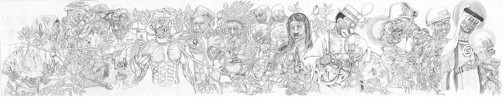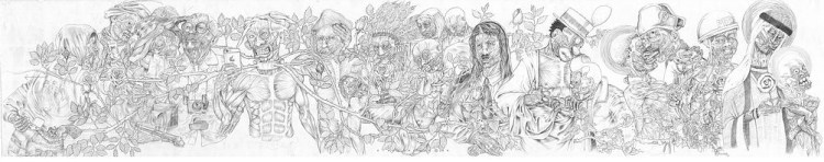 Quels secrets révèle l’introspection à laquelle se livre l’artiste ? Qui suis-je ? Qui sommes- nous ? Que me renvoie mon selfie d’écorché : une immense fresque composite de cultures diverses où apparaissent l’indien, la Piéta, Hitler  reliés au personnage central par les tiges d’un carcan. Ces tiges tortionnaires, assimilables ici aux branches d’un arbre généalogique, sont étonnamment fleuries de roses.  S’agirait – il de Fleurs du mal,  de la beauté de ce rapport au monde innovant  extraite de souffrances accumulées ? Tous ces éléments symboliques, l’écorché, les relations entre les figures, le carcan, les roses participent à la lecture de l’œuvre que fera chaque spectateur.