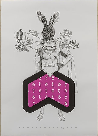 Suis – je encore cet esclave au carcan considéré comme un bien meuble sur  son socle de mobiliers anciens accumulés ?  Ou désormais cet esclave moderne à l’étroit dans son tiroir professionnel ? Ne serais – je pas plutôt le compère latin du conte antillais malin, débrouillard, susceptible de sortir de tous les tracas et même d’endosser le costume de superman ? Un être composite comme le soulignent les associations inattendues des dessins, un kangourou- cocotier, un lapin- superman ou des bustes à tête d’homme et oreilles de lapin. Tout ceci dit la complexité  de la personnalité de cet homme des îles.