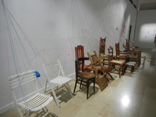 Une autre installation se compose d’une vingtaine de chaises de différentes textures, formats, taille et design, toutes reliées entre elles par des fils de laines. Pour réaliser cette installation, intitulée un lieu en liens, Elodie a été à la rencontre des habitants de Martinique, échangeant et leurs demandant une chaise. La chaise est pour l’artiste un des premiers signes d’hospitalité, thématique qui soude toute l’exposition. Il est vrai qu’une chaise et l’objet de bienvenue que l’on propose en premier à un visiteur, un ami : un lieu qui permet d’échanger.