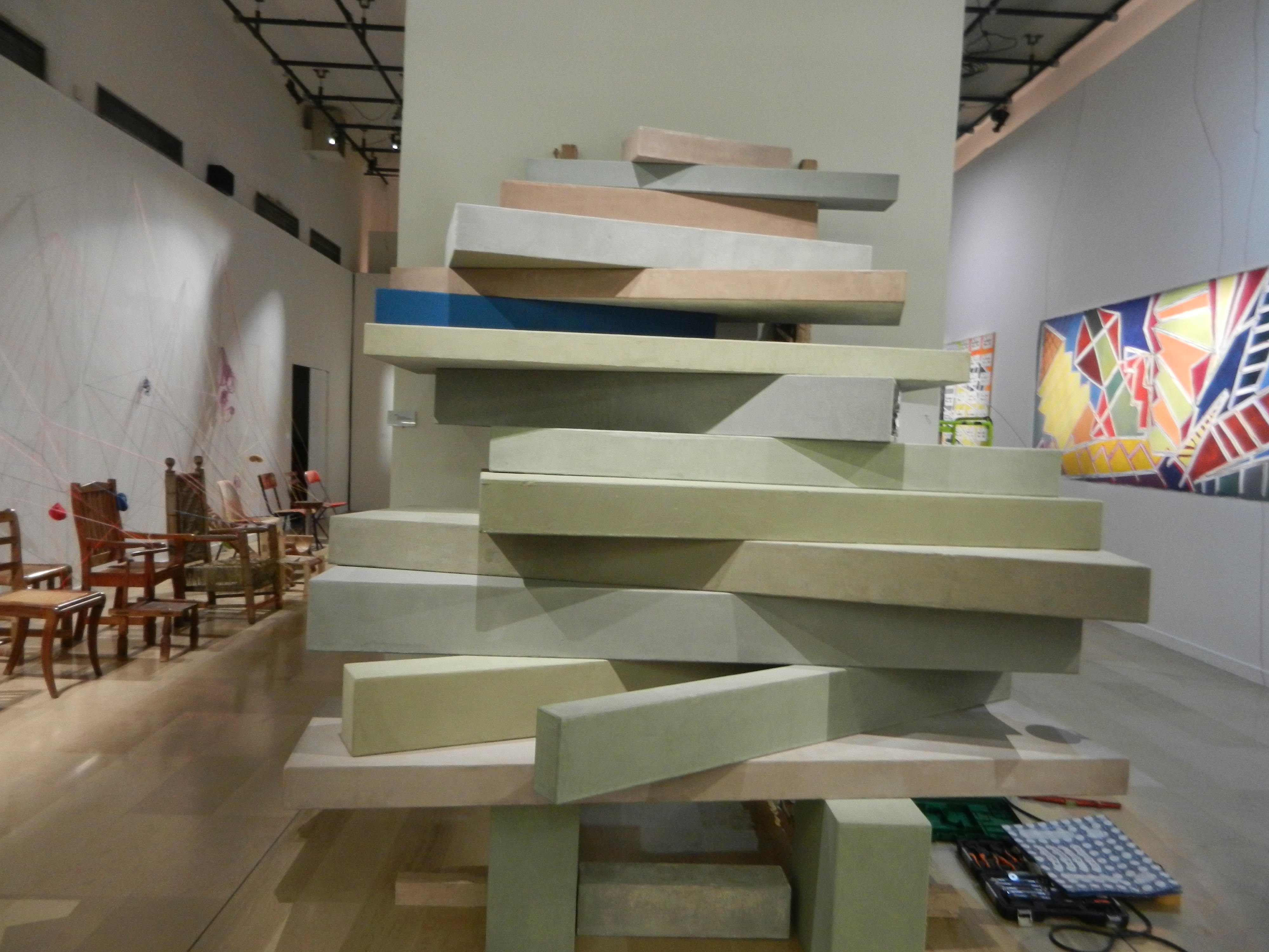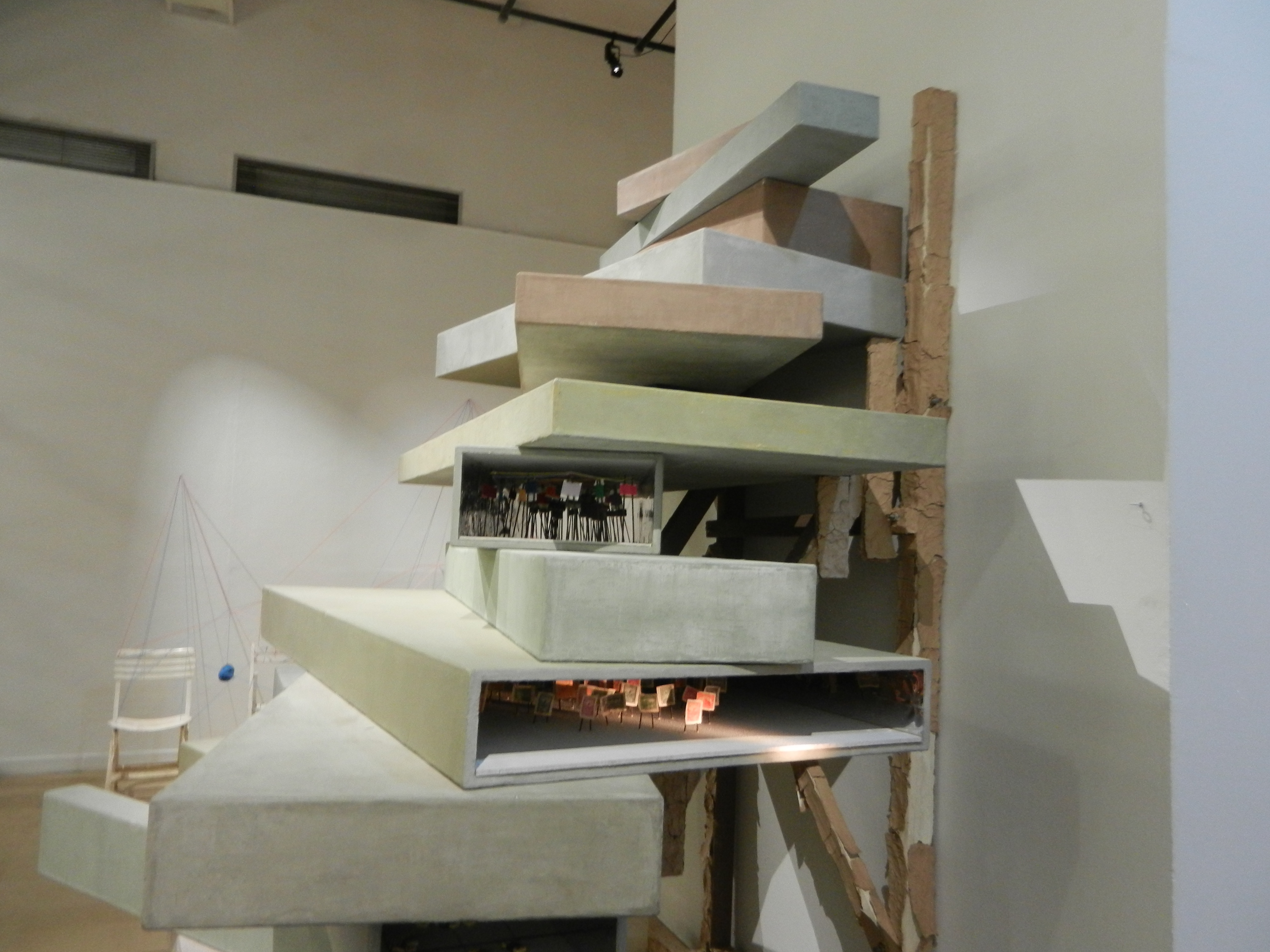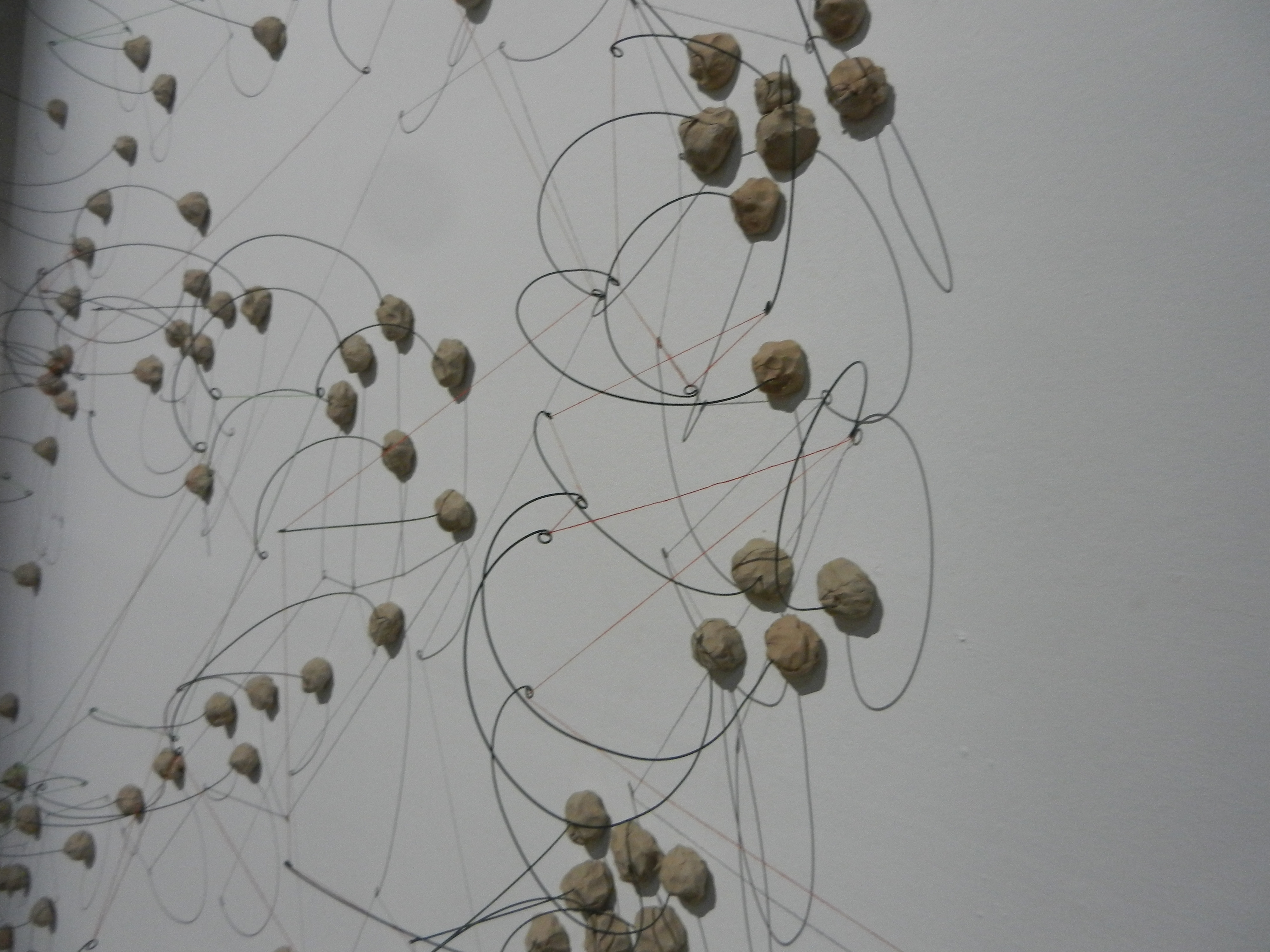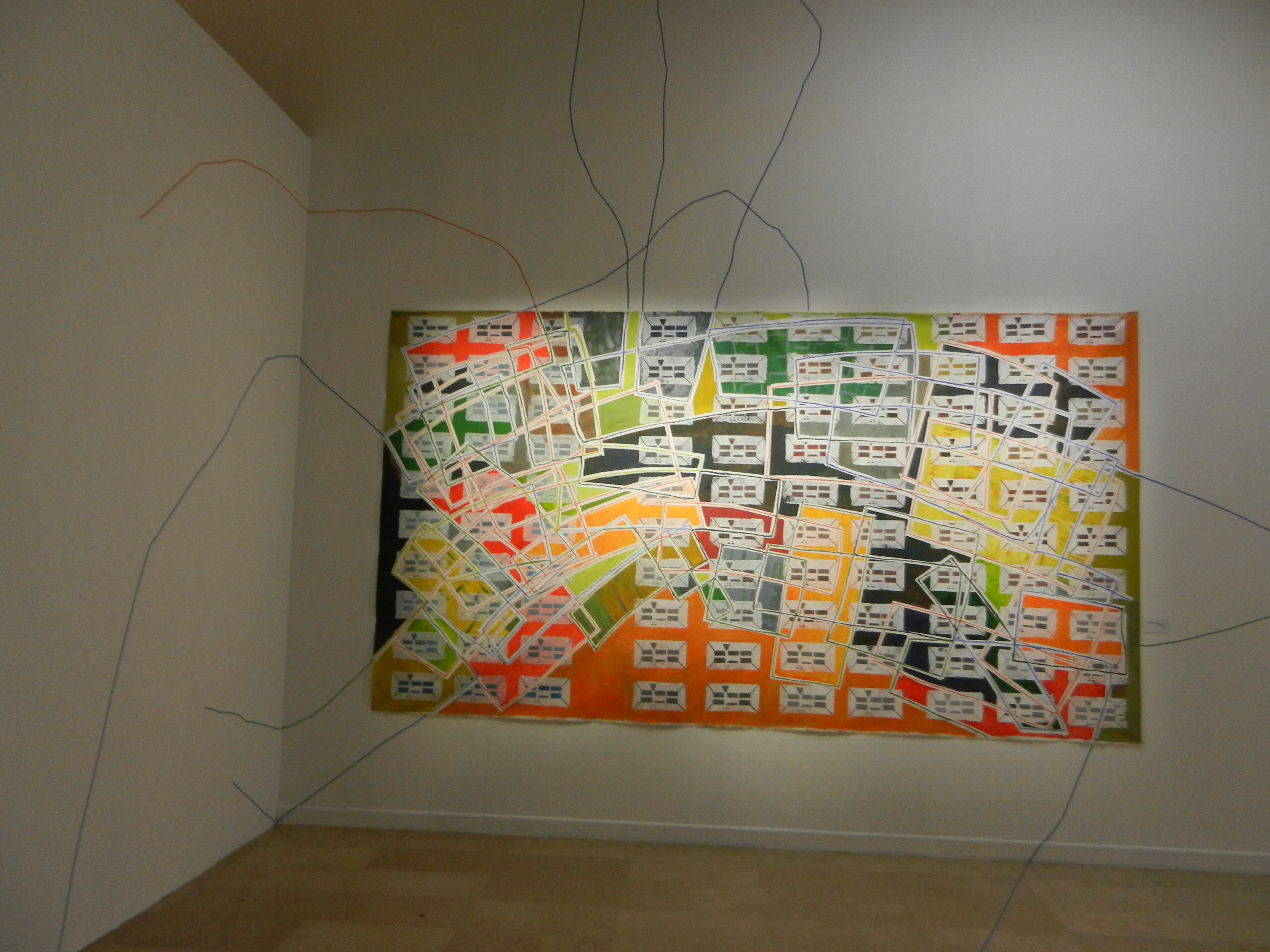Dans l’exposition au Tropiques -Atrium, intitulée « un lieu en liens », l’artiste nous présente quatre œuvres majeures : Jalouzi, qu’elle a exposé au Grand Palais à Paris en 2014 lors de l’exposition Haïti, qui restitue des habitations précaires en Haïti du quartier de Pétionville, relatant le chaos mais aussi « le coup de main » des occupants, leur incessante mise en réseau, dû à la proximité de leurs liens. Cette œuvre livre son sens dans le contexte actuel des immigrés de nombreux pays occidentaux, allant des jungles de Calais, aux camps de réfugiés dans le monde. La pièce se présente comme plusieurs marches d’escaliers à l’apparence de ciment, blocs en équilibre instable qui livrent leurs mystères, leurs énigmes et leurs cachoteries. « Jalouzi est une œuvre inspirée du bidonville éponyme de Pétionville (Haïti), ville verticale autoconstruite, instable, en constante mutation … » explique l’artiste. Cette pièce fait échos à une autre installation intitulée Les capteurs qui renvoient métaphoriquement aux liens qui se tissent entre les personnes actuelles, toujours connectées par une technologie grandissante. Très minimaliste et presque iconoclaste, cette installation se développe sur un mur de la galerie et au sol : elle soulève des questions de réseaux, de liens, de rhizome dans son aspect proliférant, semblable à un entrelacs de connections telle une multiplicité intérieure. Voila ce que dit l’artiste : « à l’atelier j’ai récréé une installation de capteurs : un brin de fer tordu planté dans une poignée d’argile. Ils ont envahi le sol. Je me suis assise au ras et j’ai observé. J’ai attendu… Rien ne se passait pourtant… Du silence… J’ai peint. »