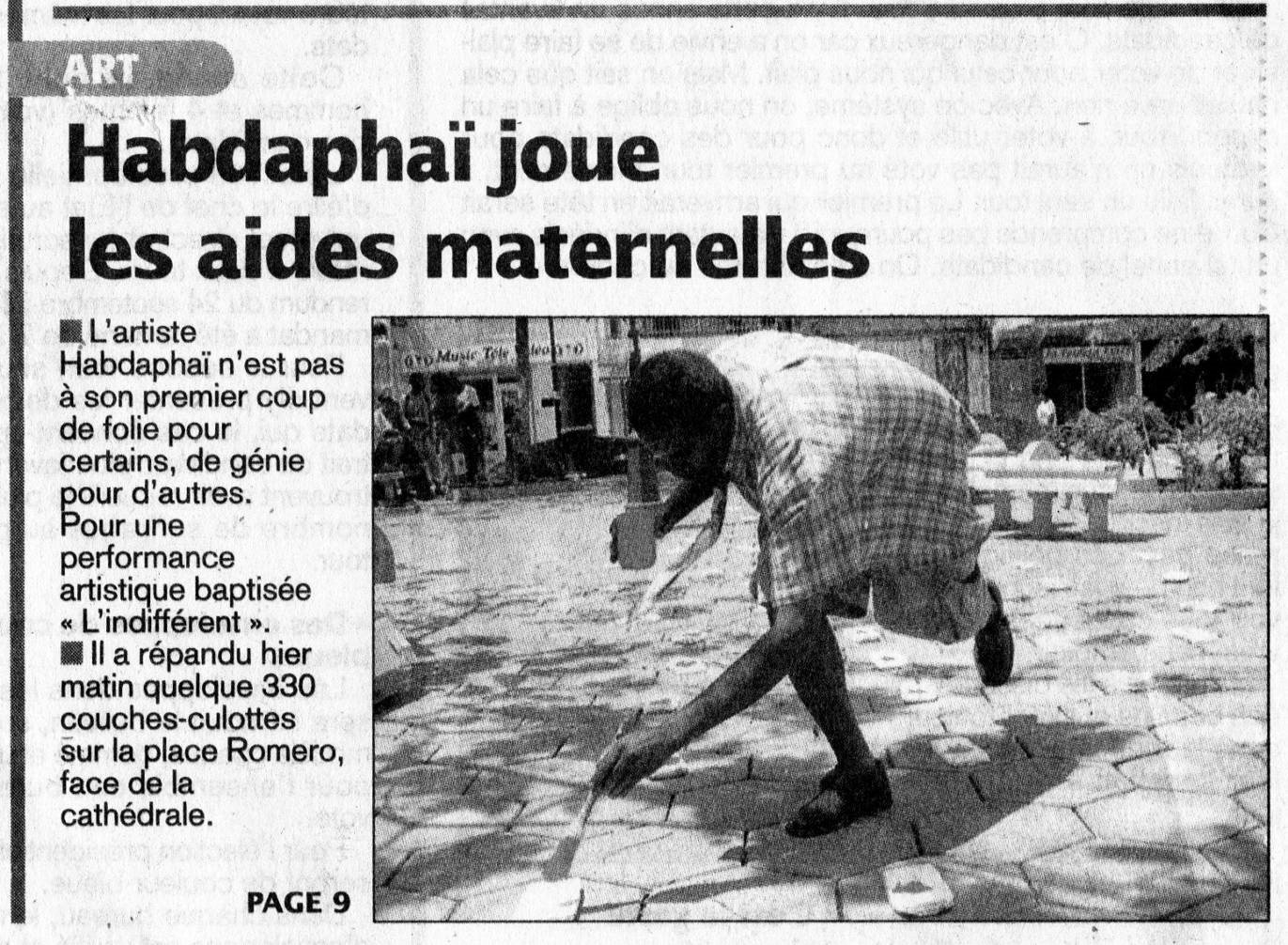 Pour Habdaphaï la performance est forcément politique, dans le sens original et le plus large du terme : une action dans la cité dont le but est provoquer une réflexion, une réaction. Il travaille avec une belle compréhension de l’espace, des espaces, l’espace physique, l’espace social avec ses composantes spirituelles, politiques, et l’espace-corps, comme il dit, son corps, les corps en performance (ce qui inclut forcément les témoins). Beaucoup de ses performances sont vocales et gestuelles, l’utilisation de la voix comme matériau l’intéressant énormément. Très profondément créolophone, dans un monde (celui de l’art) où le français prime, il travaille souvent sur le non-sens, celui d’une langue que l’autre ne domine pas. D’où des performances très intéressantes où il discoure dans une langue inconnue.